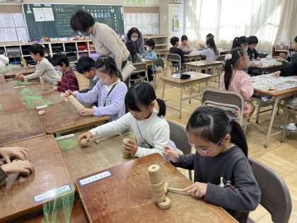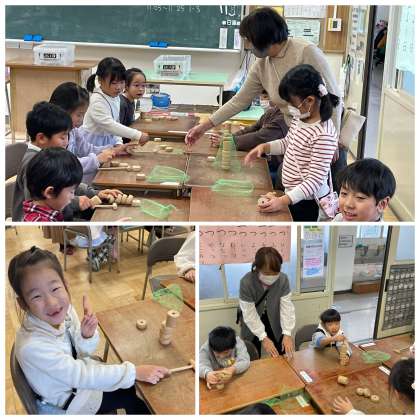 1年生のむかしあそびの会の「だるまおとし」講座のようすスナップです。