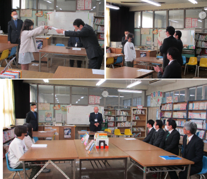愛知県庁からおみえになったお二人は、6年生が入学するときに迎えてくれた鷲見欣尚元校長先生と、30年ぐらい前に本校に通っていた卒業生の方だそうです。いつまでも応援していただける縁に感謝感謝です!