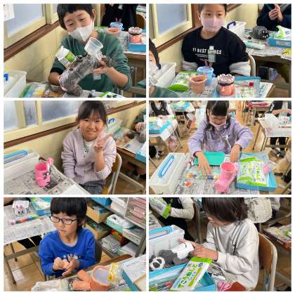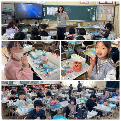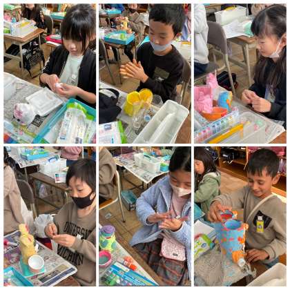 12月18日(月) 3年 空きようきのへんしん 公開日 2023/12/18 更新日 2023/12/18 3年 3年生の図工の授業のようすです。「空きようきのへんしん」の作品もいよいよ完成に近づいてきましたよ。カラフルでとても素敵な小物入れに変身しています。鑑賞会が楽しみですね。