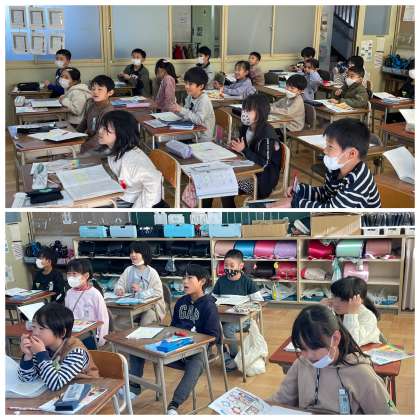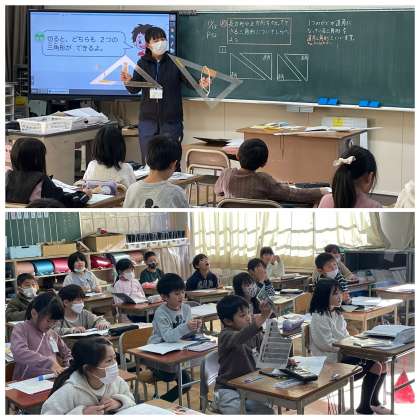 2年生の算数の授業のようすです。「長方形や正方形を切ってできる三角形についてしらべよう」というめあてで学習を進めていました。直角三角形という名を覚えましたね。
