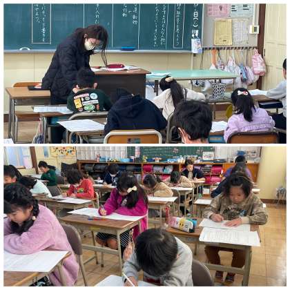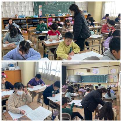 3年生の国語の授業のようすです。「物語の組み立てを考えて、下書きを完成させよう」というめあてで学習を進めていました。