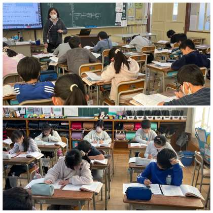 12月19日(火) 4年 問題に挑戦! 公開日 2023/12/19 更新日 2023/12/19 4年 4年生の算数の授業のようすです。「教科書の問題をといて、2学期の学びをふりかえろう」というめあてで学習を進めていました。たくさん問題に挑戦できましたね。