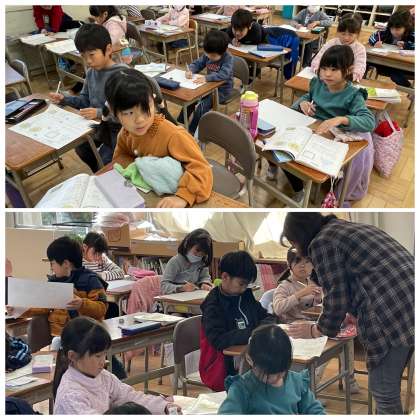 1年1組の算数の授業のようすです。計算練習プリントを使って、たしざんとひきざんの問題に挑戦していました。くり上がりやくり下がりの計算に自信を深めることができましたね。