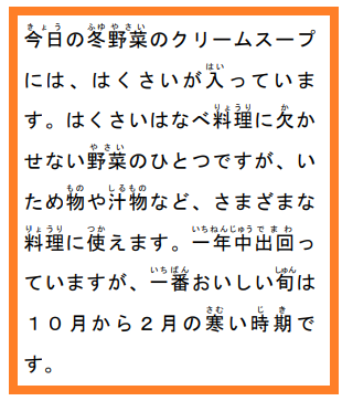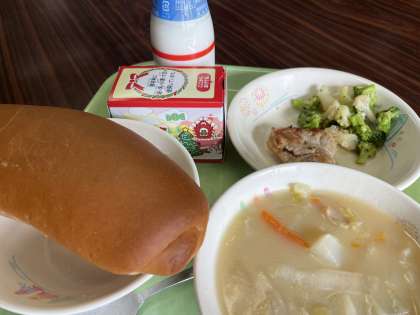 12月19日(火) 今日もおいしくいただきま〜す! 公開日 2023/12/19 更新日 2023/12/19 ひがしっ子ライフ くろロールパン、ぎゅうにゅう、スパイシーチキンドリル、はなやさいさらだ、ふゆやさいのクリームスープ、クリスマスデザート