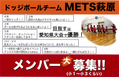 12月19日(火) ドッジボールチームMETS萩原の活動紹介 公開日 2023/12/19 更新日 2023/12/19 学校外からのお知らせ 地域の方よりドッジボールチームのメンバー募集のチラシをいただきましたので、ウェブ記事でも紹介します。対象は小学1年生から3年生です。詳細はチラシのPDFでご確認ください。 ➡チラシPDFファイルはこちらから