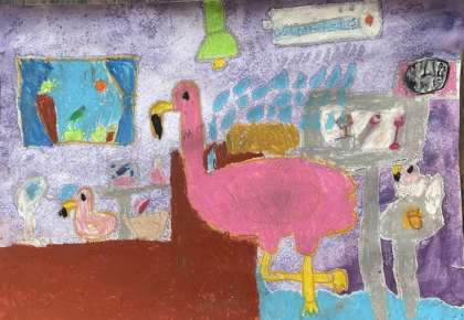 1年生の読書感想画「おはなしからうまれたよ」を紹介します。「どなたでもどうそ!」の絵本を読んで描きました。バレンタインさんのホテルにどんな動物が泊まりに来たのかな!?