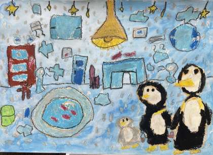 1年生の読書感想画「おはなしからうまれたよ」を紹介します。「どなたでもどうそ!」の絵本を読んで描きました。バレンタインさんのホテルにどんな動物が泊まりに来たのかな!?