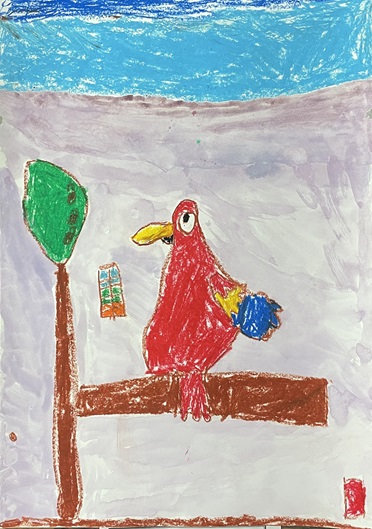 1年生の読書感想画「おはなしからうまれたよ」を紹介します。「どなたでもどうそ!」の絵本を読んで描きました。バレンタインさんのホテルにどんな動物が泊まりに来たのかな!?