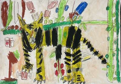 1年生の読書感想画「おはなしからうまれたよ」を紹介します。「どなたでもどうそ!」の絵本を読んで描きました。バレンタインさんのホテルにどんな動物が泊まりに来たのかな!?