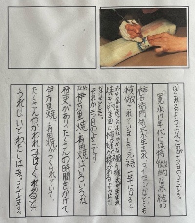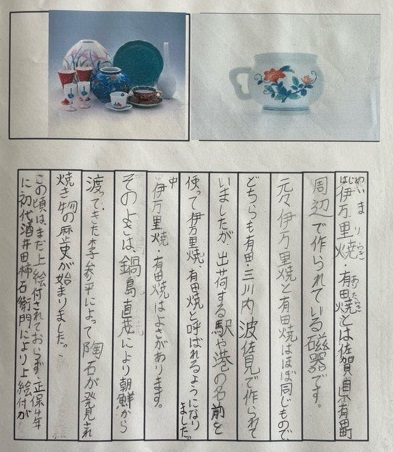 1月7日(日)4年国語レポート【冬休みウェブ展覧会309】 公開日 2024/01/07 更新日 2024/01/07 4年 4年生が国語の時間に取り組んだ「日本の伝統工芸のよさを調べて伝えよう」のレポートを紹介します。日本にはいろんな伝統工芸があることがわかりますね。