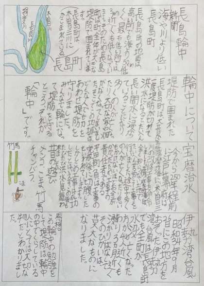 1月5日(金)4年国語レポート【冬休みウェブ展覧会275】 公開日 2024/01/05 更新日 2024/01/05 4年 4年生が社会の時間に取り組んだレポートを紹介します。校外学習で訪れた木曽三川公園で輪中について学んだことをまとめました。洪水の被害を防ぐために、とてもたくさんの苦労があったことがわかりますね。