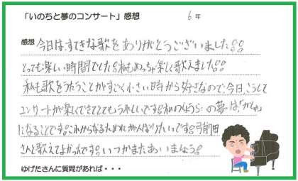弓削田健介さんの『いのちと夢のコンサート』の6年生の感想の一部を紹介します!