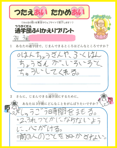 1月7日(日) 3年つたえあい たかめあい【通学団ふり返りプリント】 公開日 2024/01/07 更新日 2024/01/07 3年 みんなでめざしてきた「自慢できる通学団づくり」をふり返ってくれました。3年3組の子の思いの一部を紹介します。3学期はさらにステキな集団に成長してくれることを心より願い、応援しています!