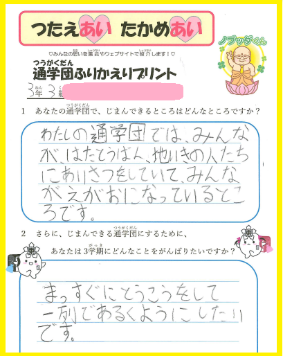 1月8日(月・祝) 3年つたえあい たかめあい【通学団ふり返りプリント】 公開日 2024/01/08 更新日 2024/01/08 3年 みんなでめざしてきた「自慢できる通学団づくり」をふり返ってくれました。3年3組の子の思いの一部を紹介します。3学期はさらにステキな集団に成長してくれることを心より願い、応援しています!