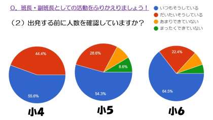 1月7日(日) 自慢できる通学団をめざして(班長副班長編2) 公開日 2024/01/07 更新日 2024/01/07 校長室便り ほとんどの班長副班長さんがちゃんと確認できています。毎日同じ人数で登校できるとは限りません。途中ではぐれたことに気づいてあげられなかったら大変なことですね。だれが集まれていなかったのかや人数を必ず確認して出発・解散できるように心がけましょう! ※回答者は班長副班長を務めている4〜6年生の一部です。(回答数は6年生76人、5年生35人、4年生9人)