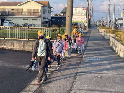 上の写真は宮地方面のようすです。いつもきれいな一列で登校できていてすばらしい!と感心しています。下の写真は妙興寺方面のようすです。班がつながって長くなっていますが、二列にならずに片側をあけて移動できていて、こちらもすばらしいですね。