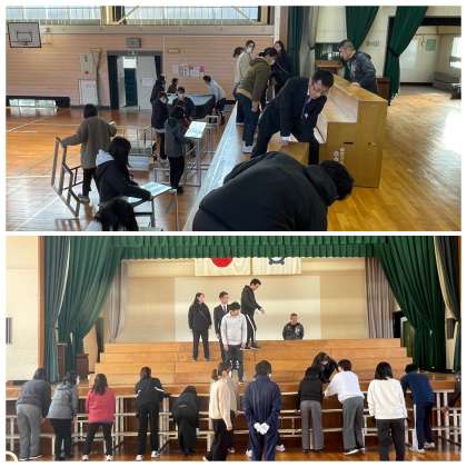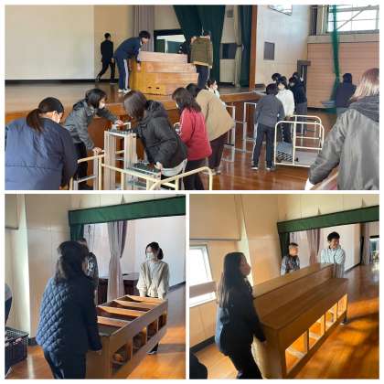職員会議の後、職員で体育館に集まって学習発表会でひがしっ子のみんなが立つステージづくりを行いました。すてきな歌声を体育館いっぱいに響かせて、聴きに来てくれた人たちに感動を伝えられるといいなあと思います。3学期のハーモニータイムや音楽・学年練習の時間を大切にして、みんなの合唱を作り上げていきましょう!