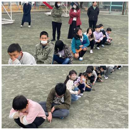 ひまわり組さんの避難訓練のようすです。運動場に一番に移動し、静かに全校が避難するのを待ち、しっかりと先生のお話を聞くことができました。教室で地震時の行動についてどんなお話をしたか、おうちの人にも伝えて確認しましょう。また、防犯ブザーもおうちの人と一緒に点検しておきましょうね。