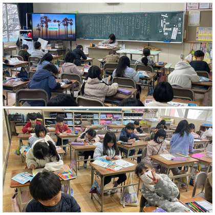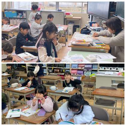 1年4組の学級の時間のようすです。3学期の生活や学習の目標を決めて、掲示物にする活動に取り組んでいました。ていねいな字で目標を書いて、すてきな色づけをして飾ることができましたね。目標を達成できるようにみんなで応援し合いましょう!