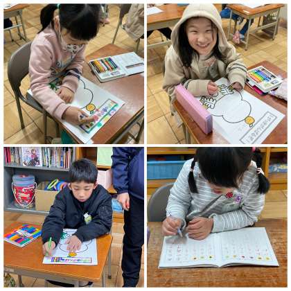 ひまわり組さんの今日の活動のようすです。ひっ算の練習をしたり、ひらがなの練習をしたり、3学期の目標の掲示物を作ったりしました。ていねいに取り組むことができましたね。