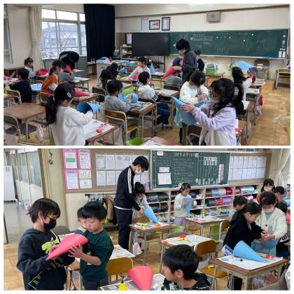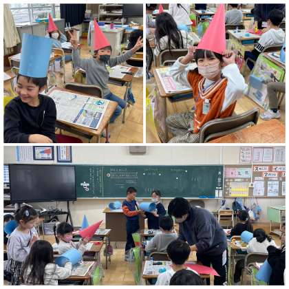2年生の図工の授業のようすです。「ぼうしのかたちをつくろう」というめあてで学習を進めていました。ボンドを使って紙をつなぎ、帽子の元の形をしっかりとつくることができましたね。
