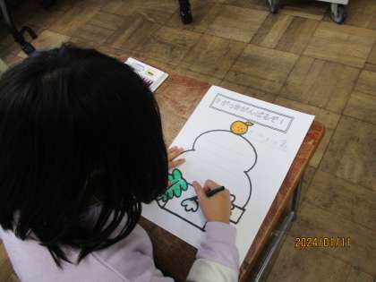 1月11日(木) 3学期のめあて ひまわり組 公開日 2024/01/11 更新日 2024/01/11 ひまわり組 今日の様子です。3学期のめあての用紙に丁寧に色を塗りをしました。枠からはみ出さずに上手に仕上がりました。目標を書いて完成したら教室に掲示します。 ひまわり組