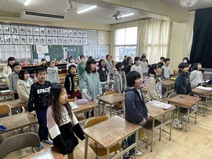 3年3組のハーモニータイムのようすです。校務主任の先生と一緒にしっかりと準備をして、楽しい歌の時間を過ごすことができましたね。