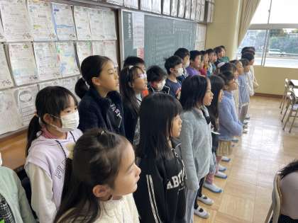 3年2組のハーモニータイムのようすです。先生の指揮に合わせてやさしい澄んだ響きの声で歌えるようにがんばっていましたね。