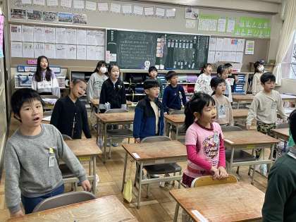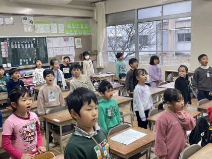 1月12日(金) 1年 金曜の朝はハーモニータイム! 公開日 2024/01/12 更新日 2024/01/12 1年 1年生の朝の活動のようすです。担任の先生と一緒に学習発表会の歌をはりきって歌うことができましたね。