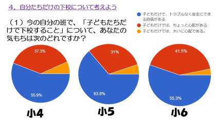 2学期の終わりに高学年の人たちに行ったアンケートで「先生のサポートなしに自分たちだけで下校すること」についての気持ちを問う質問に、半分ぐらいの人たちが「心配がある」と回答しました。