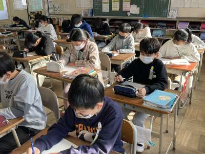 1月16日(火) 5-3 漢字の練習 公開日 2024/01/16 更新日 2024/01/16 5年 5年3組の国語の授業のようすです。「漢字の復習をしよう」というめあてで、プリントを使ってこれまで学習した漢字の習得状況を確認していました。