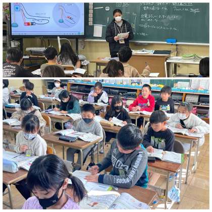 3年生の理科の授業のようすです。「どんなものが電気をとおすかな」というテーマで学習を進めていました。実験でわかったことをみんなで確認できましたね。