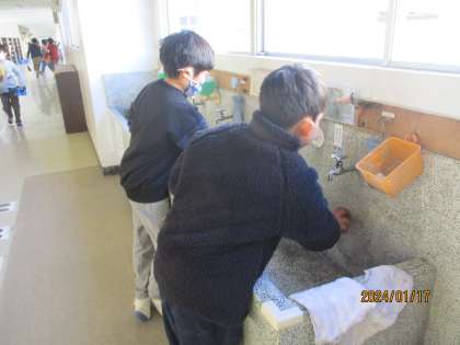 今日のそうじ時間の様子です。教室や手洗い場など、自分の担当する場所をきれいにしています。廊下や空気の入れ替えをしている教室は寒いですが、頑張っています。
