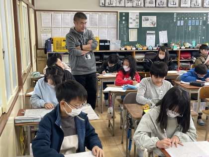 4年1組の図工の授業のようすです。版画の作品作りに取り組んでいました。設計図を作って下書きをし、板にていねいに写していきました。
