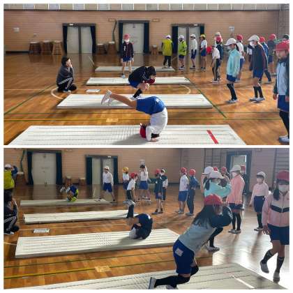 4年生の体育の授業のようすです。くるりと流れるように好転ができるように、手の位置や勢いに気をつけて練習に励んでいました。