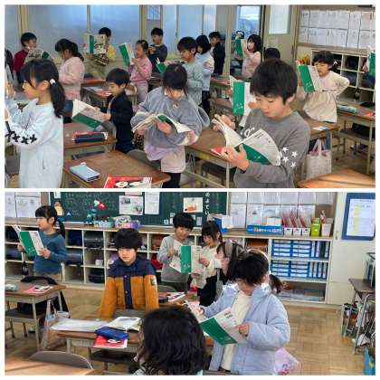 1月19日(金) 1-1 たぬきの糸車 公開日 2024/01/19 更新日 2024/01/19 1年 1年1組の国語の授業のようすです。たぬきの糸車の物語の場面分けを確認した後、をみんなで息を合わせて、はっきりとした声で伝わるように音読していました。
