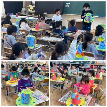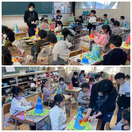 2年生の図工の授業のようすです。素敵な飾りつけをしてかっこいいぼうしに仕上がりましたよ!学習発表会の展示が楽しみです。