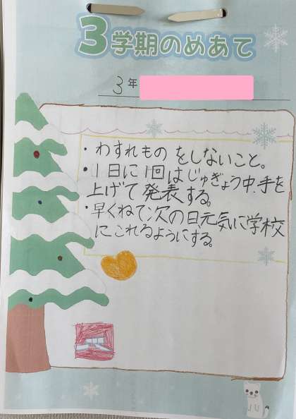 1月19日(金) 3年ウェブ展覧会【3学期の目標】 公開日 2024/01/19 更新日 2024/01/19 3年 3年生の教室の掲示物を紹介します。3学期の目標が書かれていましたよどんな目標を立ててがんばっているかな。みんなの目標を応援していますよ!