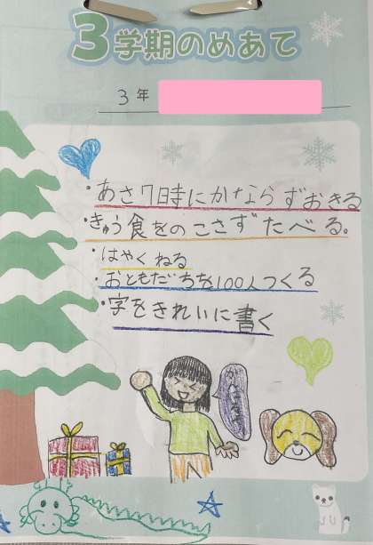1月20日(土) 3年ウェブ展覧会【3学期の目標】 公開日 2024/01/20 更新日 2024/01/20 3年 3年生の教室の掲示物を紹介します。3学期の目標が書かれていましたよどんな目標を立ててがんばっているかな。みんなの目標を応援していますよ!