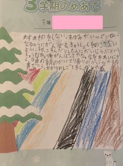 3年生の教室の掲示物を紹介します。3学期の目標が書かれていましたよどんな目標を立ててがんばっているかな。みんなの目標を応援していますよ!