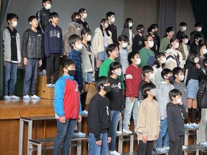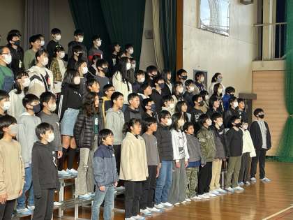 1月22日(月) 6年 学習発表会に向けて 公開日 2024/01/22 更新日 2024/01/22 6年 6年生の学年音楽の授業のようすです。音楽の先生や担任の先生のアドバイスを聞きながら、思いが伝わる合唱になるように高めていきました。インフルエンザや体調不良で参加できていない友達の分も思いを伝えようとがんばってくれていました。