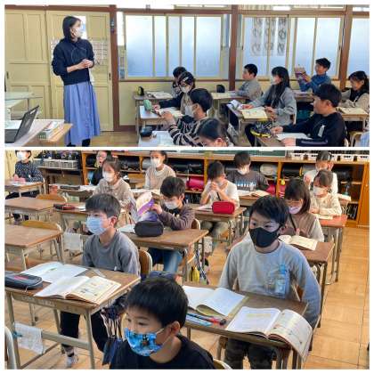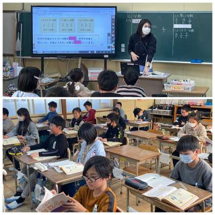 4年生の算数の授業のようすです。真分数と仮分数について学びました。「分子」と「分母」ということばを使って、2つの分数の説明をしたり、なかま分けしたりすることができましたね。