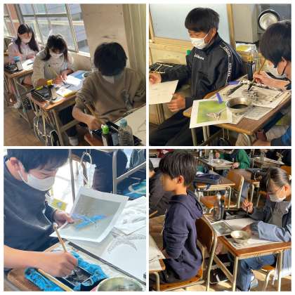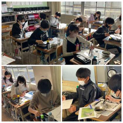 6年生の図工の授業のようすです。「墨の濃淡で生き物を表現しよう」というめあてで作品作りに取り組んでいました。イメージしたことを表現しようと、工夫して筆を運んでいましたね。