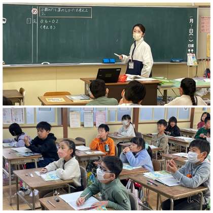 3年生の算数の授業のようすです。「小数のたし算のしかたを考えよう」というめあてで学習を進めていました。整数のたし算の考えを使って、0.1が何個あるかを考えながら計算することができましたね。