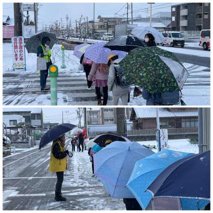 今朝の見守り活動のようすスナップです。横風が雪を運び、全身雪だらけになってしまう時間帯がありましたが、見守りのみなさんのおかげで、子どもたちは安心して登校することができたようです。あたたかいお声かけをありがとうございました!
