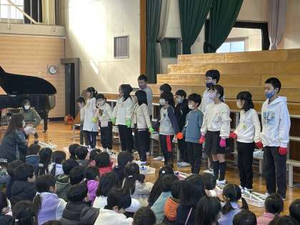 1月25日(木) ひまわり組 校内合唱発表会 公開日 2024/01/25 更新日 2024/01/25 ひまわり組 ひまわり組さんの発表のようすです。「どきどきぢてきた〜!」と発表前に教えてくれましたが、みんなで気持ちをひとつにして全校の前で発表をやり切りましたね。交流学級や通学団の友だちも応援してくれていました。体育館いっぱいに広がった拍手がうれしかったですね。