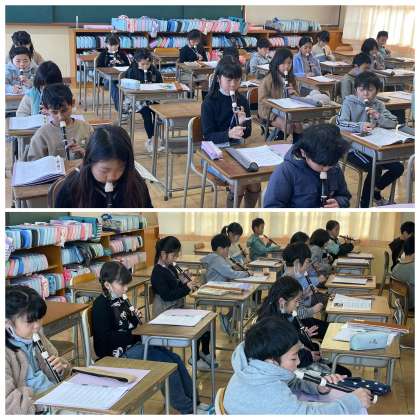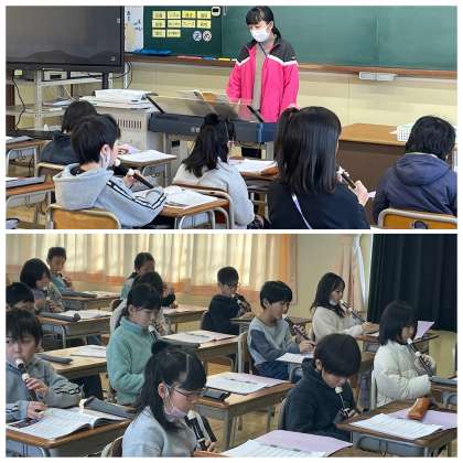 1月26日(金) 3-3 せいじゃの行進 公開日 2024/01/26 更新日 2024/01/26 3年 3年3組の音楽の授業のようすです。アメリカ民謡の「せいじゃの行進」の曲を2つのパートに分かれて合奏していました。