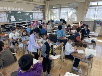 1月26日(金) 2-1 おにごっこ 公開日 2024/01/26 更新日 2024/01/26 2年 2年1組の国語の授業のようすです。「くふうを考えよう」というめあてで、にげる人だけが入れるところを作ったり、つかまらないときを決めたりする遊び方の工夫を考えました。
