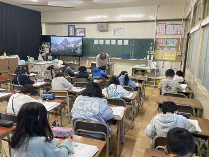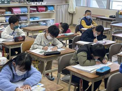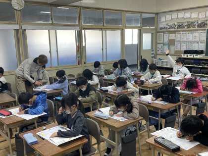 1月30日(火) 2-4 形のちがい 公開日 2024/01/30 更新日 2024/01/30 2年 2年4組の書写の授業のようすです。「文字の形のちがいに気をつけてかこう」というめあてで学習を進めていました。