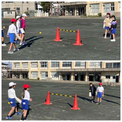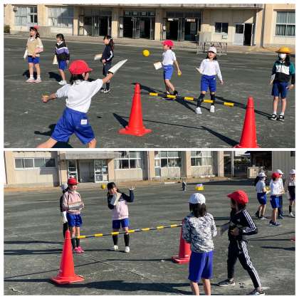 3年生の体育の授業のようすです。牛乳パックで作った道具を手にはめてボールを打つ「テニピン」を楽しんでいました。上手くボールを打つことができたかな。